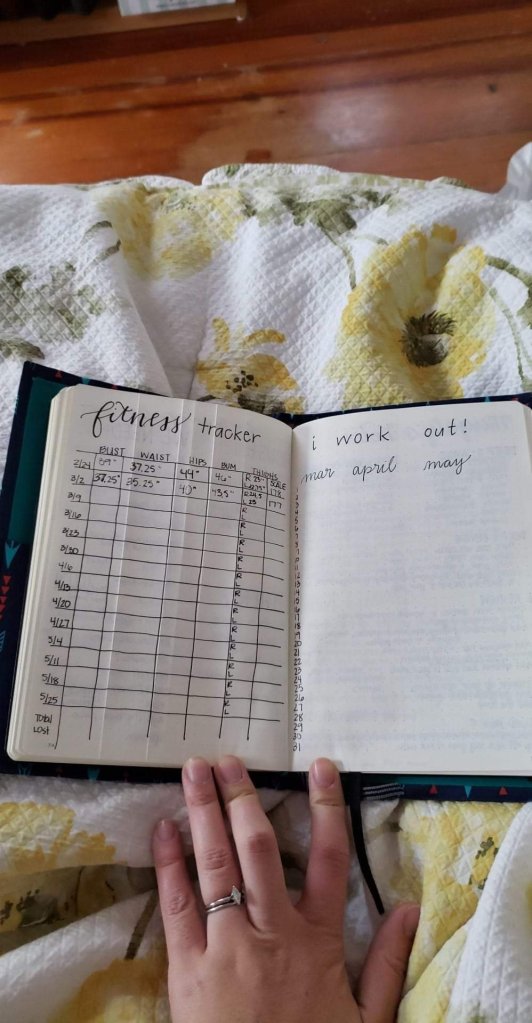 Here is my bullet journal spread tracking inches, pounds, and workouts. The scale said I was down one pound, but if you look closely, I lost around seven inches altogether in different spots on my body. What??