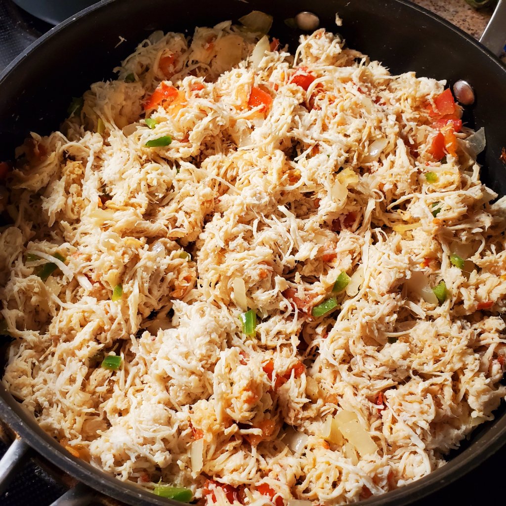 In a skillet, add coconut spray or 1 tsp of coconut oil with veggies to sauteed on medium low. Once they are soft add the shredded chicken. Seasoned with garlic, salt and pepper and incorporate well.