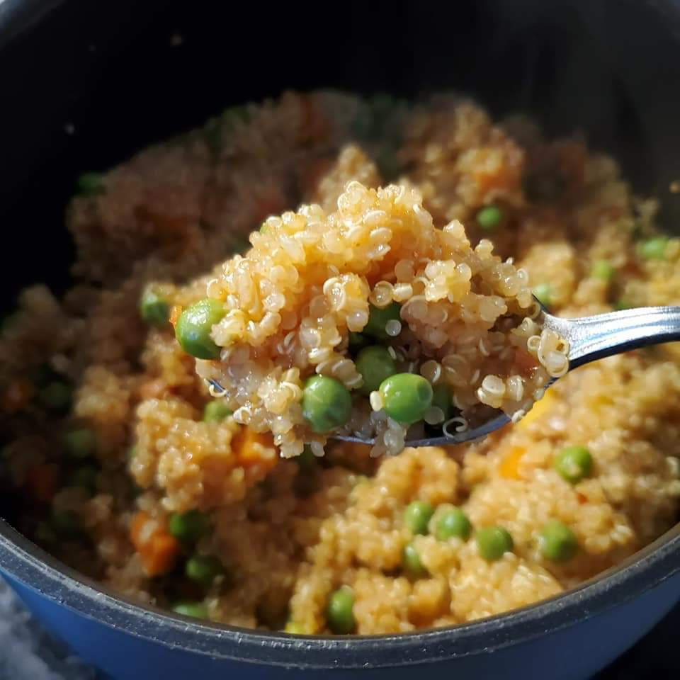 Toast the quinoa with seasonal blend with 1 tsp of coconut oil in a saucepan. Once it has been toasted add homemade tomato sauce or half a can of Rotel, chicken bouillon and 2 cups of chicken broth or water. Stir, cover, and simmer on medium heat. Don’t add the peas & carrots till most of the liquid have been absorbed. Check in about 8-10 minutes and stir again. The Spanish quinoa should be ready when liquid is absorbed.