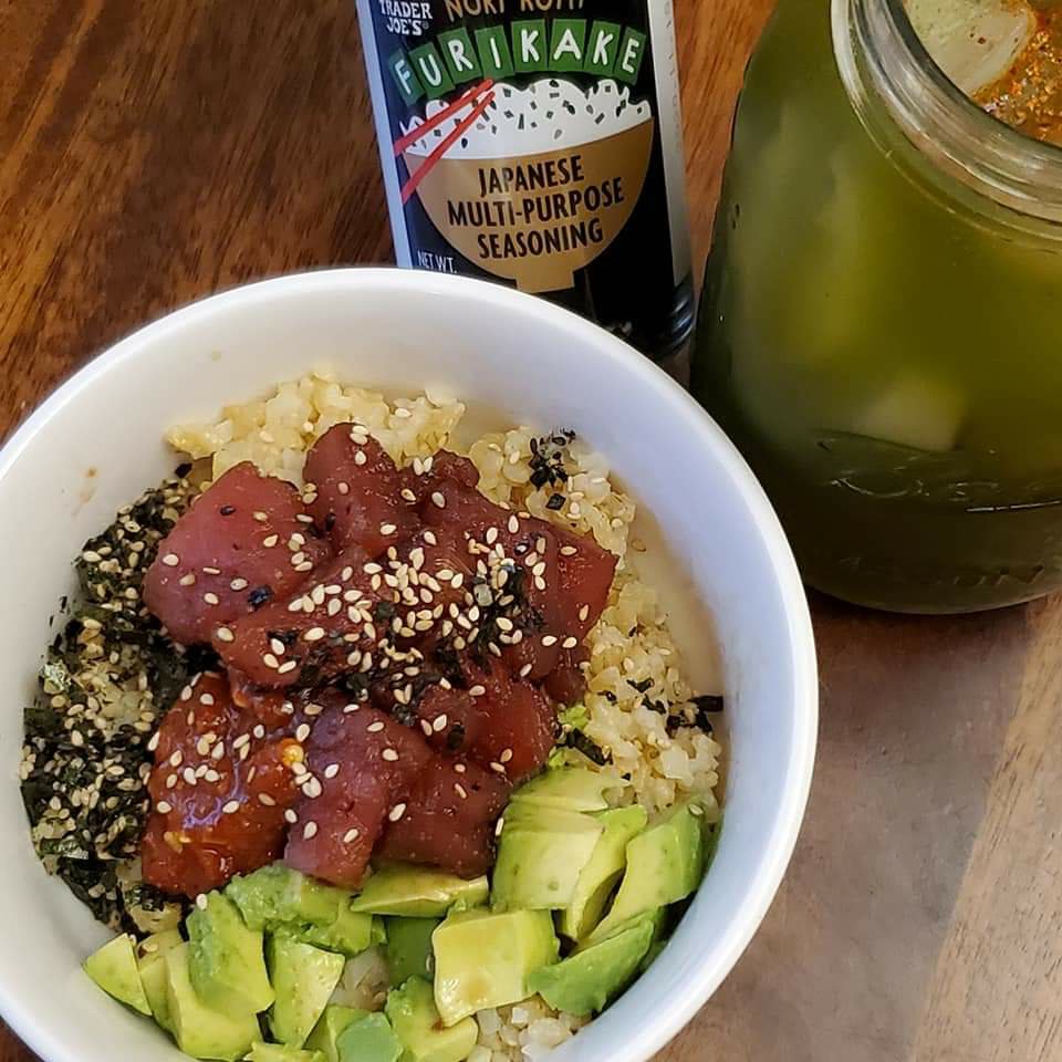 Cooked your brown rice or I uaully buy the pre-made brown rice container and warm up. Add the marinated tuna on top of the rice and sprinkle with more Japanese seasoning.