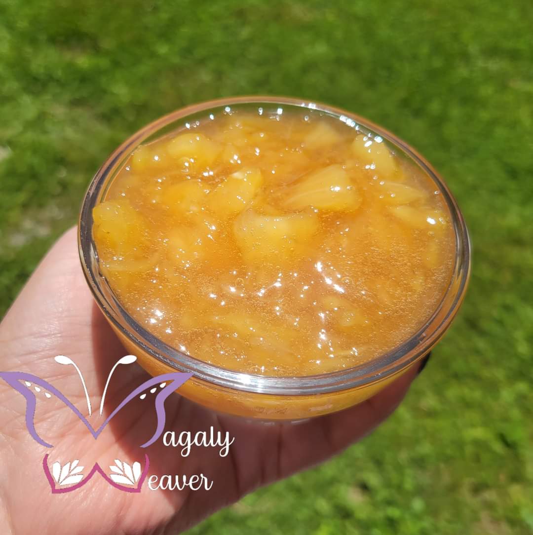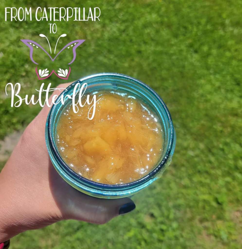 2. Use an utensil to smash the fresh pineapple chunk. Add the rest of the ingredients. Once it starts to boil turn it down to low heat. You’ll start seeing the content is thickening quick. Stir occasionally. Simmer for around 8 more minutes. Put aside and let it cool. Add to a jar.