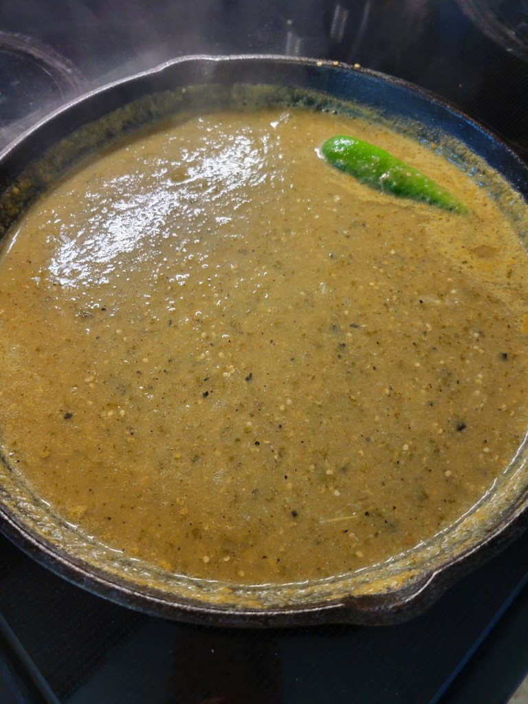 - Back on the skillet, spray with coconut oil and add the green-go sauce mixture and let it simmer uncovered for approximately 15 minutes on medium low heat. Finish seasoning with salt and pepper to your liking adjusting the flavors if you like for more heat by adding cayenne pepper or add in a whole serrano pepper for extra heat.